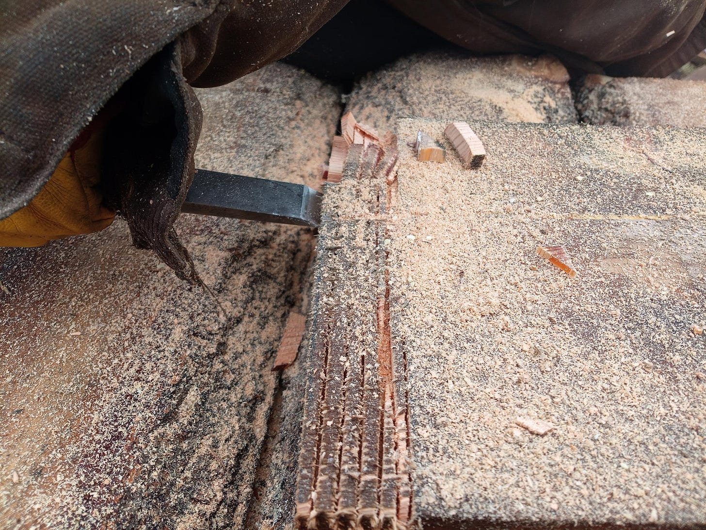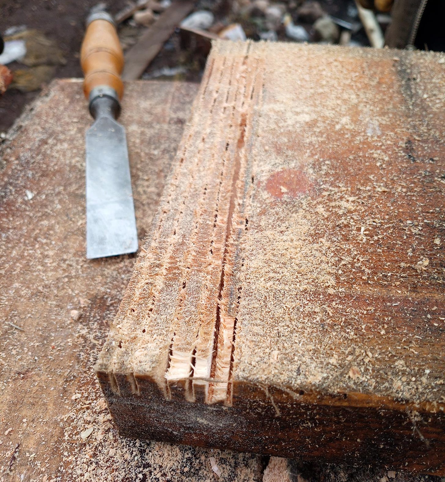 My wily and slapdash plan now complete, I started with the joinery. Each tread got the same treatment at each end: